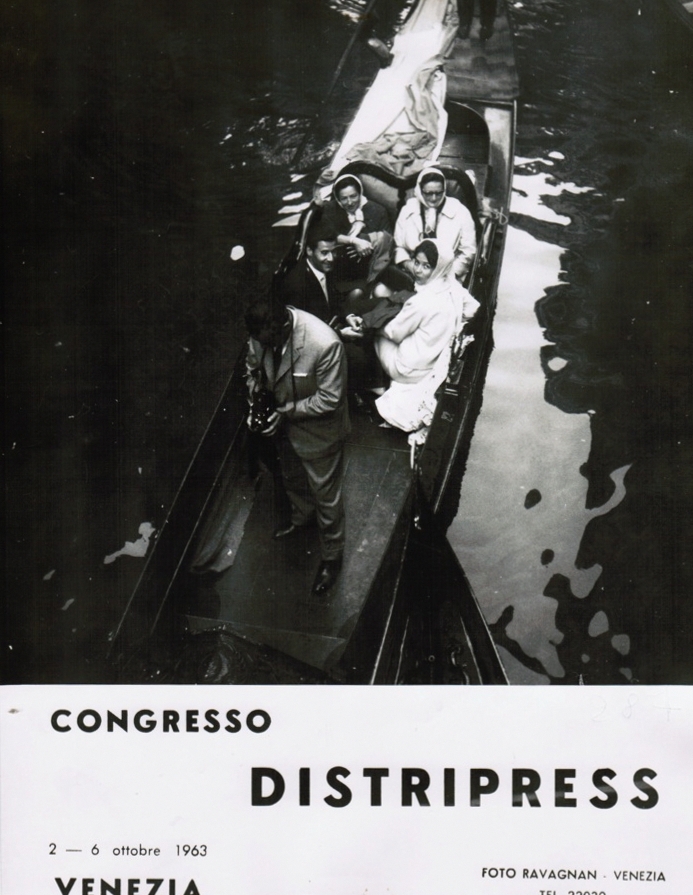 Cette photo date d’il y a cinquante ans, elle a été prise lors d’un congrès d’éditeurs de journaux à Venise, à une époque où ceux-ci n’avaient jamais entendu parler d’ordinateurs et d’internet. Le monsieur qui prend une photo avec son Rolleiflex à l’avant de la gondole est mon père. La dame en foulard et lunettes sur le siège arrière est ma mère. L’image, tirée sur papier cartonné de bonne qualité, est signée par le studio "Ravagnan". Il y en avait trois dans les archives que mon père a conservées jusqu’à sa mort. Aujourd’hui, il existe une galerie d’art moderne du même nom sur la place Saint-Marc, je ne sais pas s’il s’agit de la même famille.