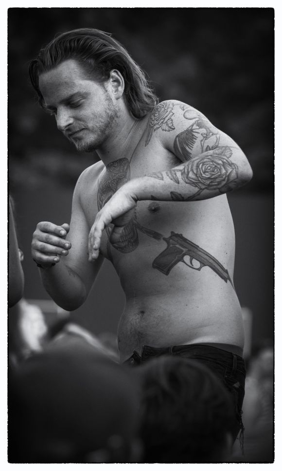 Tendance 2015: combiné avec de la dentelle noire chez les femmes. Cela dit - je ne parle pas des deux personnes ici, dont les tatouages sont assez réussis, je suis frappé de constater comment une marque distinctive qui était à l’origine celle des yakuzas japonais, bad boys new yorkais et autres personnages sulfureux, est devenue en une quinzaine d’années la décoration obligée de Monsieur et Madame Duchmol, souvent d’un affligeant contraste entre le motif agressif et les chairs plus ou moins flappies. L’autre jour, je parlais à un serveur qui, à côté de symboles plutôt sombres, s’était fait tatouer le drapeau suisse, sur un coup de tête, le jour où l’équipe nationale de foot avait battu l’Espagne au Mondial… Et dire qu’après ce match, la Nati n’avait plus rien fait. Mais le tatouage, lui, est resté. Je me demande si des sociologues se sont penchés sur la question.