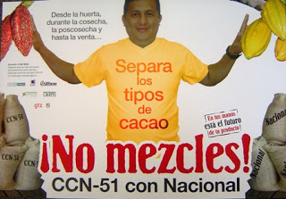 Ce que je verrai aussi, pour sûr, ce sont des affiches comme celle ci-dessus. "Ne mélangez pas le CCN51 avec le Nacional!", recommande-t-elle. Pour le profane, admettons que c'est un peu abscons. Pour comprendre le slogan, il faut savoir que l'Equateur est le premier exportateur de cacao dit "fin", qui se traite évidemment avec une prime sur le marché mondial. Cette famille de cacaos plus aromatiques porte le nom "Nacional", ou "Arriba".